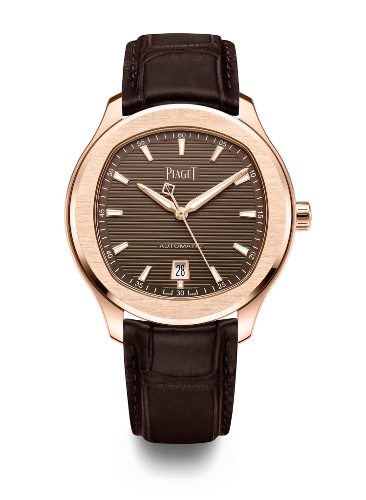 Left: Adam Driver on the red carpet at the 77th Cannes Film Festival wearing a Piaget Polo Date watch. (Photo by Stephane Cardinale – Corbis/Corbis via Getty Images). Courtesy Piaget. Handout via The Gourmet Gazette. Right: The Piaget Polo Date watch is outfitted with a rose gold case and an automatic mechanical Manufacture movement. Photo courtesy Piaget. Handout via The Gourmet Gazette