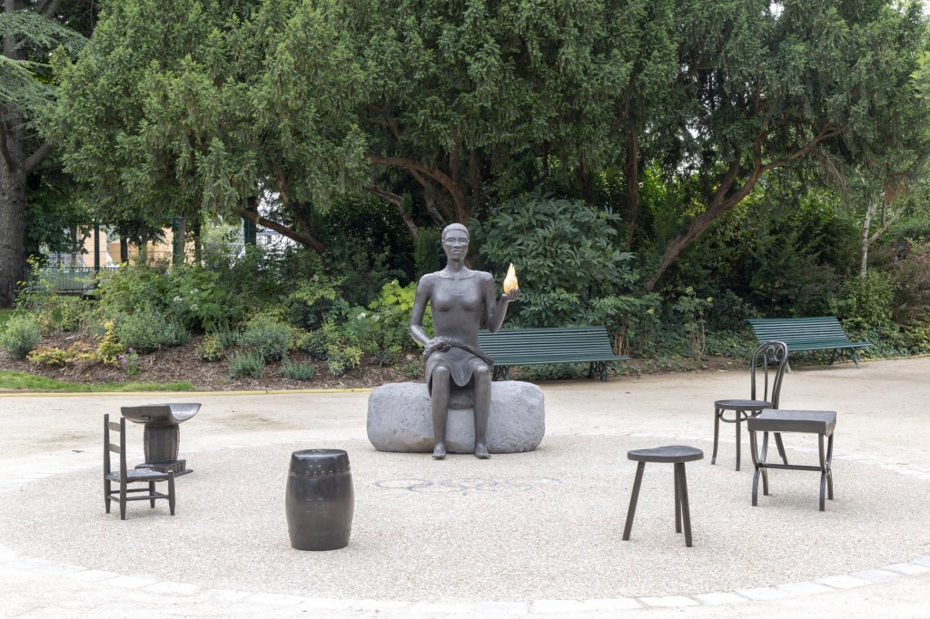 Alison Saar’s mission was to create a sculpture destined to link the City of Light with the City of Angels. She called her work Salon in reference to a private salon or living room but also to the salons that the American writer and art collector Gertrude Stein held in Paris bringing together artists, writers, musicians and intellectuals to share their ideas and their work. The feminine figure is surrounded by six seats further inviting people to come in, sit down and talk, and to share. The six seats represent a different region of the world and types of seats, for example the West African seat is the one used for traditional discussions beneath the baobab tree while the classic Thonet chair evokes Europe. The work marks the first time one of her sculptures has been exhibited outside of the United States and her first international commission. She has been creating art works for over four decades and her works have been exhibited in the Metropolitan Museum of Art, the Whitney Museum of American Art and the Los Angeles County Museum of Art (LACMA). She created the monumental sculpture of Harriet Tubman, the American abolitionist who worked to free enslaved people, that stands in Harlem.
