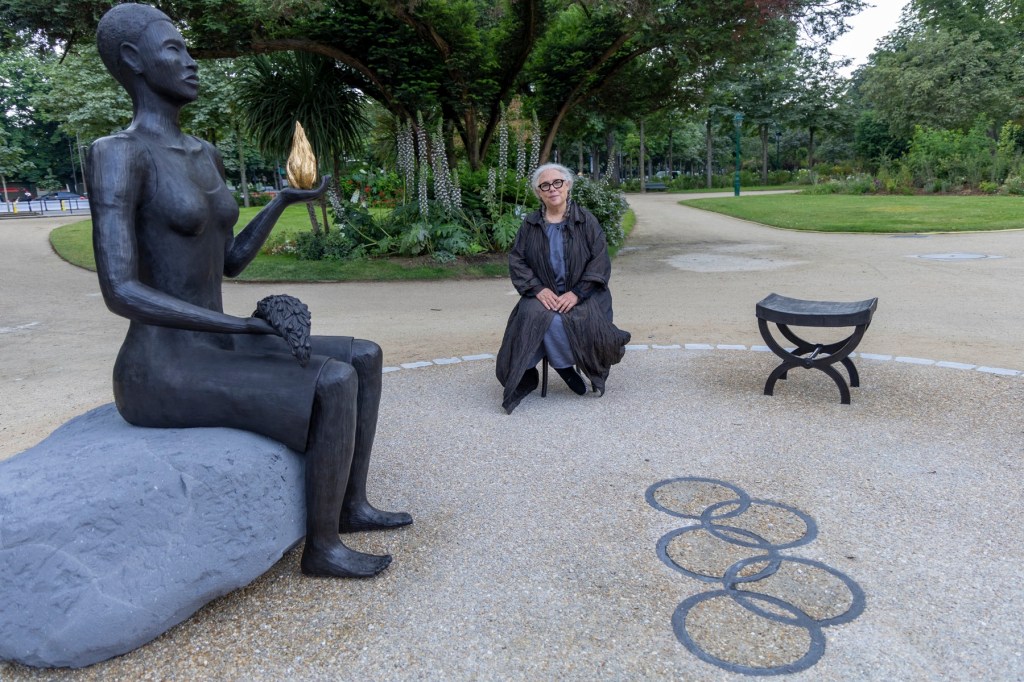 Paris, France — She holds an olive branch in one hand and a glowing flame in the other. The monumental official Olympic sculpture for the Paris Olympic Games was created by the American artist Alison Saar who hails from Los Angeles. Entitled Salon, the impressive art work sits in the beautiful public gardens of the Champs-Elysées and is a work of art that will become a permanent part of the Parisian public art landscape. Alison Saar was selected by the International Olympic Committee and the city of Paris to create the work which was conceived as an invitation to the public to meet, dialogue and share with other people illustrating her Olympic ideal of a peaceful and inclusive society.