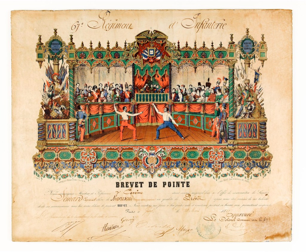 Paris, France — While the fabulous fencing competitions are taking place beneath the spectacular glass cupola of the Grand Palais in Paris, on the other side of the Seine river you can immerse yourself into the art of duelling at the Musée de l’Armée, France’s national military museum housed in the Invalides with its glowing glass dome. The Hôtel national des Invalides is presenting an exhibition entitled Duels, the Art of Fighting which explores the history of this ancient activity whose origins can be traced back to Ancient Egypt and which continues to live on into the present. From East to West, from reality (like Alexander Hamilton and Aaron Burr) to fiction (The Three Musketeers), the duel has been used throughout history by men (and sometimes women) to resolve a dispute, seek redress, or for the sake of honor. Two adversaries met in single combat that was staged according to very precise rules with the duel being a form of scheduled, ritualized, even choreographed and legitimised violence. It complies with a protocol and depending upon the era and the country has been more or less tolerated.