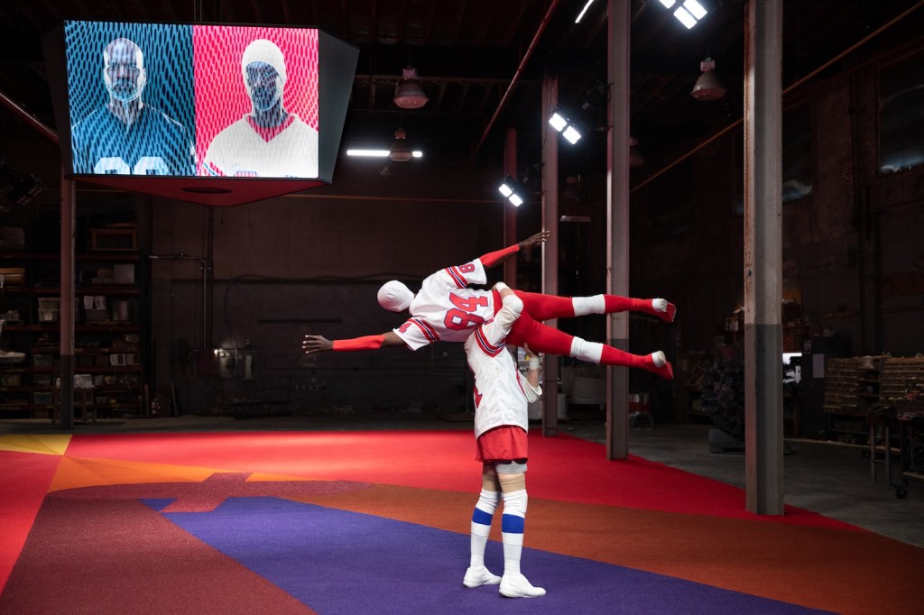 Filmed in Matthew Barney’s sculpture studio on the East River in Long Island City in the New York City borough of Queens, it features 11 performers, mainly dancers and movement artists with older bodies, including the artist who is 57, abstracting the action that takes place on the football field. This new work demonstrates the complex superposition of real violence and its representation — as well as celebration—through sports entertainment. It examines the game and affiliated culture through a unique movement vocabulary developed in collaboration with the cast of performers, including movement director David Thomson, and Mr. Barney. The result is a highly physical, bodily study that focuses on every element of the game: training drills, pre-game rituals, moments of impact, and slow-motion replays.