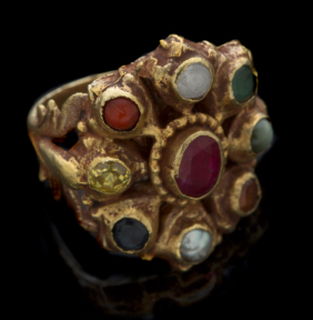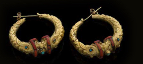 Left: Ring from Tibet in 18k gold set with nine gemstones representing the sun, the moon and the seven cosmic stars. The stones are coral, pearl, garnet, emerald, tiger’s eye, topaz, sapphire and ruby. It is estimated at US$ 2,200-3,300 (2,000- 3,000 euros). Photo courtesy Aguttes. Handout via The Gourmet Gazette. Right: Earrings of tilahari beads in 22k gold with floral and star patterns from Nepal. It is estimated at US$ 2,200-3,300 (2,000- 3,000 euros). Photo courtesy Aguttes. Handout via The Gourmet Gazette