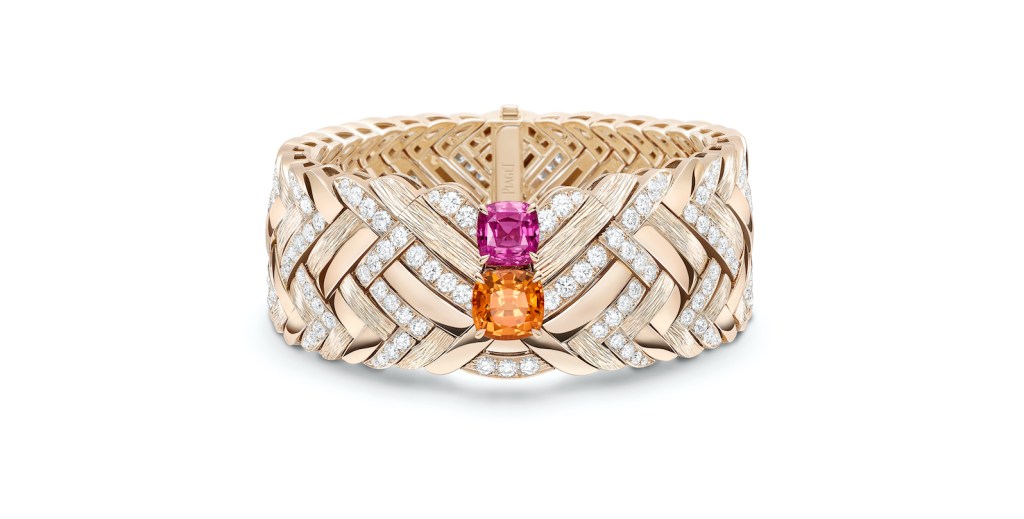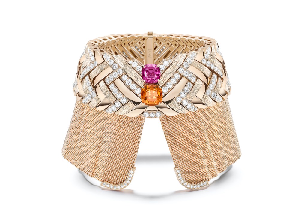The graceful mesh High Jewelry cuff bracelet is shown right without the lower Milanese mesh element and left with the lower Milanese mesh element. It features a 6.43 carat cushion-cut spessartite and a modified brilliant-cut pink sapphire from Madagascar weighing 4.52 carats. This creation can be re-produced. Copyright Piaget. Handout via The Gourmet Gazette