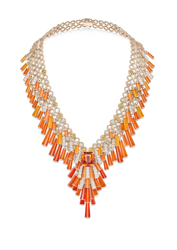 Piaget High Jewelry necklace in 750/1000 pink gold set with 1 cushion-cut spessartine garnet(approximately 21.23 cts) yellow sapphires, cornalines and diamonds. This is a unique creation. Copyright Piaget. Handout via The Gourmet Gazette