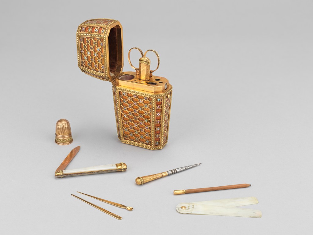 Paris, France — Tiny perfume bottles, tobacco pouches, snuffboxes( carried by women as well as men) and beauty boxes (often holding a beauty mark) with a mirror on the inside lid all could fit neatly and discreetly into an aristocratic pocket back in the 18th century and early 19th century. The precious pocket-sized pieces required a host of craftsmen to fashion them ranging from painters, enamelers, stone cutters, varnishers and goldsmiths. Candy boxes, writing cases, embroidery sets, opera glasses all became luxurious fashion accessories and were often given as gifts and were the object of collections.