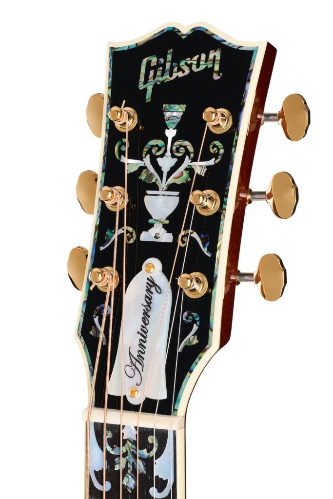 Crafted in Bozeman, Montana, in the Custom Shop, this guitar features delicate inlay work throughout the entire instrument from the small details in the ebony bridge to the complex inlay work on the fingerboard. Complex inlays continue throughout the headstock with the extended “Harp Lady” design, an abalone Gibson logo, and an abalone border around the bound headstock. The pick guard features an inlaid abalone border with a special “130” inlay displayed on the corner of the pick guard. A mother-of-pearl truss rod cover, engraved “Anniversary” in script font, covers the adjustable truss rod on the front of the headstock. To complete the anniversary details, a special 130th Anniversary label is placed in the sound hole. Mother-of-pearl and abalone are among the most precious of materials and are frequently used in the making of high jewellery pieces.