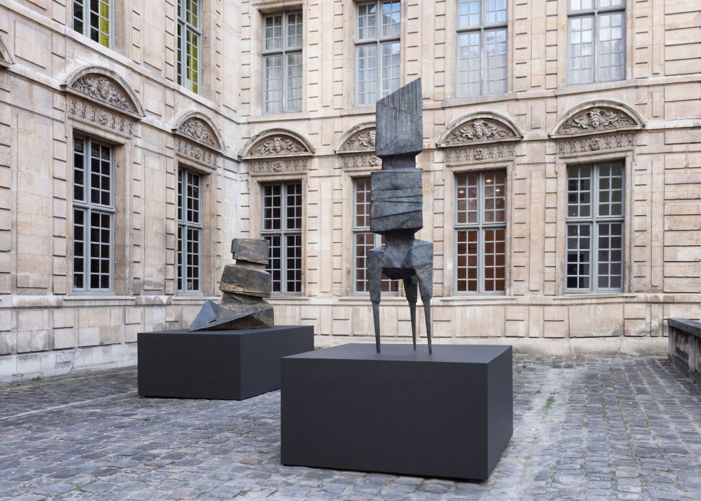 Paris, France —One of the more memorable events held during Art Basel Paris which took place during the Paris art week devoted essentially to contemporary art were the monumental outdoor sculptures found in hidden and not so hidden outdoor spaces in the French capital. This year the Centre des monuments nationaux whose acronym is CMN (France’s National Monument Center) participated in the Art Basel Paris Public program for the very first time and the result was nothing less than aesthetically spectacular. Tucked away in the gardens of the CMN’s headquarters in a Parisian manor house, the Hôtel de Sully, the sculptures of Lynn Chadwick came into view in this wonderful green space nestled between the Place des Vosges and the rue du Faubourg Saint-Antoine. Other participating venues of the CMN were the monumental Hôtel de la Marine on the Place de la Concorde and the Domaine national du Palais Royal. And the good news is that the show goes on in two of the venues. And with free admission.