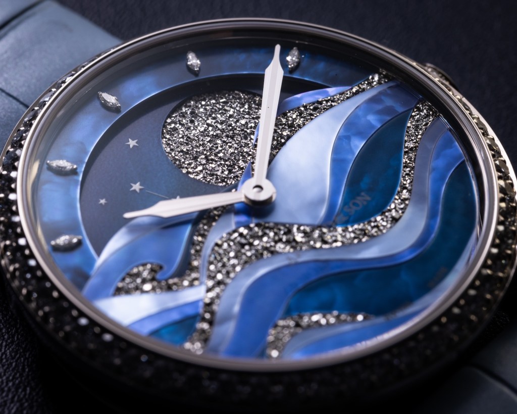 Diamonds, white gold, mother-of-pearl and ruthenium blend together gloriously on the Perpetual Moon 38 Night Tide from the house of Arnold & Son. This is a blue moon with cascades of soft waves for this watch celebrates the fluctuating pull of this celestial body —our moon — on the water of the seas. Powerful and plentiful, the waves of Perpetual Moon 38 Night Tide herald heavy seas. In the blue of the night, the tide is at its highest, and so are the rollers. Arnold & Son interprets this powerfully symbolic scene through mechanisms and minerals. The astronomical moon complication of Perpetual Moon 38 Night Tide is adorned in mother-of-pearl and ruthenium: a delicate, evocative composition that fully expresses the dial-makers’ expertise. The mother-of-pearl marquetry, ruthenium crystal inlays and abundance of diamonds symbolise the painstaking care lavished on the women’s collections of Switzerland’s most English brand.