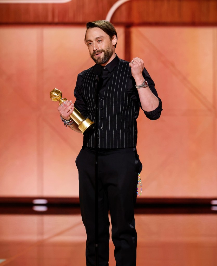 Winner of the Best Performance by an Actor in a Supporting Role in Any Motion Picture for A Real Pain, Kieran Culkin wore a 38 mm Omega Seamaster Aqua Terra Shades in stainless steel with a lacquered terracotta dial. Above Left: BEVERLY HILLS, CALIFORNIA – JANUARY 05: Kieran Culkin accepts the award for Male Supporting Actor – Motion Picture at the 82nd Annual Golden Globe Awards at The Beverly Hilton on January 05, 2025 in Beverly Hills, California. (Photo by Sonja Flemming/CBS via Getty Images). Photo courtesy Omega. Handout via The Gourmet Gazette. Above right: a 38 mm Omega Seamaster Aqua Terra Shades in stainless steel with a lacquered terracotta dial. Photo courtesy Omega. Handout via The Gourmet Gazette