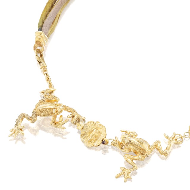 There is the iridescent moonlit bee pendant of gold with its diamonds, rubies and soothing moonstone. And straight out of the lily pond comes a group of leaping 14k gold frogs. Flying right in is a gilded cricket adorned with diamonds, emeralds and a black star sapphire eye, aptly named the Celestial Serenade Pin. The designer jewelry brand Vivienne Charles launched part of its first collection entitled Birds, Bees, and Things from the Sea Collection, an array of sculptural handcrafted jewels in precious and noble materials celebrating nature last March 24th, just in time to ring in spring.