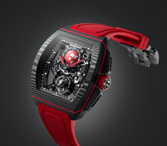 The eye-catching Bianchet B 1.618 Flying Tourbillon Sport GMT embodies a perfect harmony between lightness, robustness, and refinement. Its high-density carbon case, infused with titanium powder, withstands shocks up to 5000G and is water-resistant to 100 meters (330 feet), showcasing technical excellence. The centrepiece of the titanium movement is a flying tourbillon that ensures absolute precision, while vulcanized rubber straps provide comfort and optimal adaptability.