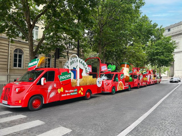 Paris, France — One of the most colorful segments of the Tour de France bicycle race happens when the whimsical caravans lead the way into the towns, villages and countryside as the race wends its way around the hexagon. The race, arguably the most famous in the world and one of the most grueling, winds up in Paris tomorrow on the Champs-Elysées after climbing up the hill of Montmartre for the first time, actually three times up, and too narrow for the caravans to lead the way. This year’s race saw the gleaming Panzani caravans cruise around for the first time in many years as the house of pasta making became an official partner of the Tour, as the race is affectionately known. The French pasta maker sent five caravans in blazing green and red colors around the land during the race’s 21 legs celebrating France’s durum wheat flour sector while putting in the spotlight the fields where the wheat grows and those that cultivate it.