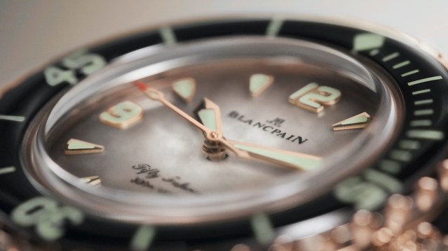 With the 2025 Year of the Ocean in full swing, it seemed appropriate to look at the latest releases from one of the pioneering diving watches: Blancpain’s Fifty Fathoms. Last June, Blancpain introduced two eye-catching yet powerful new Fifty Fathoms Automatique models in a 38 mm format, distinguished by striking mother-of-pearl dégradé dials in petal pink and smoky black. Dubbed, Fifty Fathoms, Her Way, These two new models represent the debut of Fifty Fathoms models for women. These two new Fifty Fathoms Automatique timepieces for women introduce, for the first time, a 38 mm case to the iconic line. The iridescence of mother-of-pearl, a luminous treasure from the sea, takes center stage in these new models. The black dial, with its dégradé effect, is paired with a polished 18 ct red gold case and outfitted with a smoky black rubber strap while the pink model with its petal mother-of-pearl dial is framed by a brushed titanium case with a subtle greyish tone and outfitted with a whimsical white strap with pink stripes.