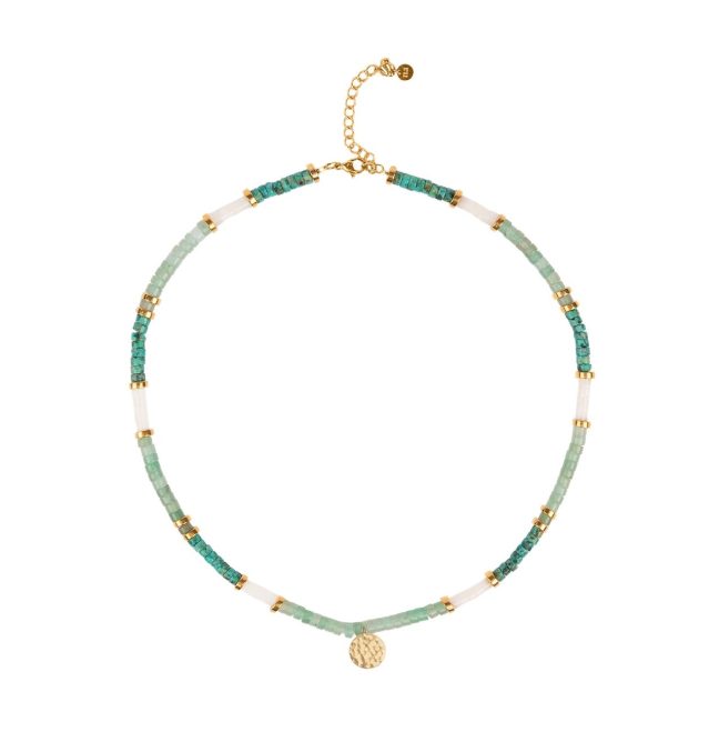 The Nosara necklace from Nouvel Amour features three natural stones; aventurine, African jasper and mother-of-pearl. Named for a popular surfing spot in Costa Rica, the necklace’s vibrant green colors bring to mind the luxuriant vegetation of this Central American country. The length of the necklace is ajustable and its hammered medal can be personalised. Photo courtesy Nouvel Amour. Handout via The Gourmet Gazette