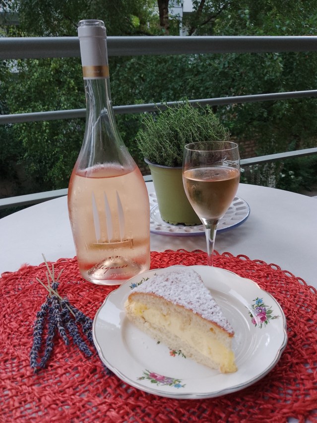 We’re prolonging the summer with the estate’s Cuvée Elégance which bears the Côte de Provence AOP appellation, or designated label of origin. This is an astonishing rosé, versatile, it fully embodies the good earth of the Mas de Pampelonne sun-drenched vineyards, a blend of silica and fine sand all bathed in the breeze of the Mediterranean sea. The traditional grape varieties are blended into Elégance with elegance. Grenache, Syrah and old growth Cinsault vine plants are harvested by hand before dawn and then directly pressed to capture the purest essence of the grapes. Its delightful salmon pink color is imbued with ruby red flecks, especially when enjoyed in sunlight. It can certainly be served at cocktail time but does just fine with goat cheeses and grilled fish. In a nod to Saint-Tropez, we served it with a famous regional dessert pastry, the tarte tropézienne, a rich number of brioche, pastry cream, butter cream and dusted with sugar sprinkles. Translation: a thick, rich, creamy icing cake, for the icing lovers in all of us.