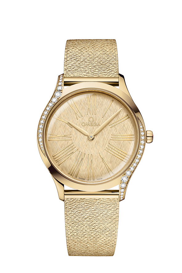 Omega’s De Ville Trésor with a 36 mm dial in Moonshine™ 18k gold set with 38 diamonds. Photo: Courtesy Omega. Handout via The Gourmet Gazette