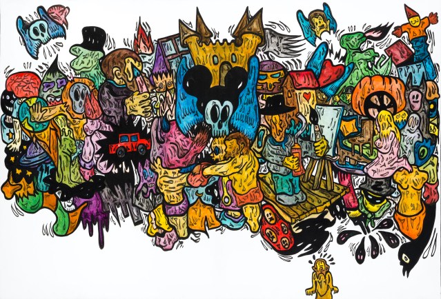 It’s a joyful jumble of dragons, castles, cartoon characters and more. The works of Fabien Verschaere jump out at the spectator, for spectators we become carefully perusing these delightful canvases at times magical, at times maniacal but always meaningful and ever so memorable. The contemporary French artist Fabien Verschaere is at the center of a show at the Galerie Laurent Rigail art gallery in the Marais neighborhood of Paris and he has surrounded himself with fellow contemporary artists in this upbeat, colorful group show entitled Fabien Verschaere and Guests, The Ones That We are. It’s a beautiful blend of abstract, figurative and landscape works.